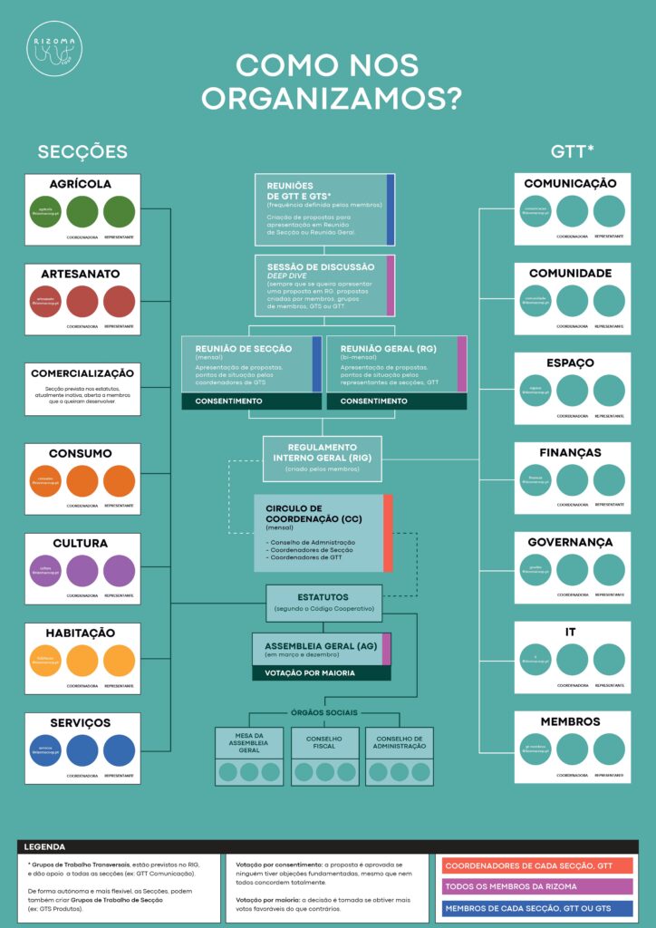 Começámos por abrir uma mercearia comunitária, mas hoje a Rizoma é uma cooperativa multissetorial, com seis secções ativas: a Secção de Consumo, que gere a Mercearia, a Secção Cultura, que gere a Cave Cultural, a Secção de Serviços, que gere o espaço de co-work, a Secção Habitação – Habirizoma, a Secção Agrícola e a Secção de Artesanato.